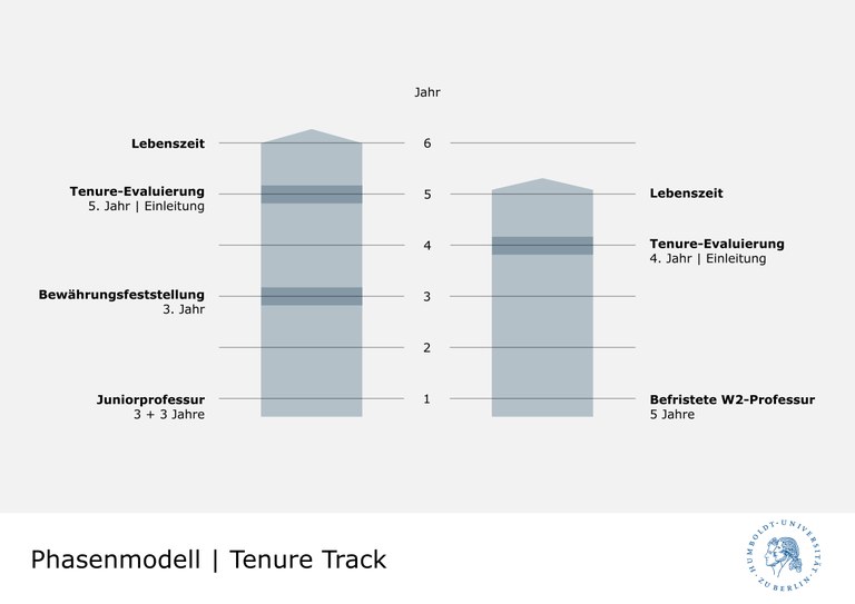 An der Humboldt-Universität zu Berlin werden Tenure-Track-Professor*innen für 6 Jahre berufen. Sie erhalten die Aussicht, dass Sie nach einer erfolgreichen Bewährungsphase unmittelbar auf eine unbefristete Professur übernommen werden. Die Wertigkeit der Anschlussposition steht bereits bei Ausschreibung fest. Der Übergang auf eine dauerhafte Professur hängt von der erfolgreichen Bewährungsfeststellung im vierten Jahr sowie von der erfolgreichen Tenure-Evaluierung nach bei der Berufung vereinbarten Leistungsanforderungen ab.